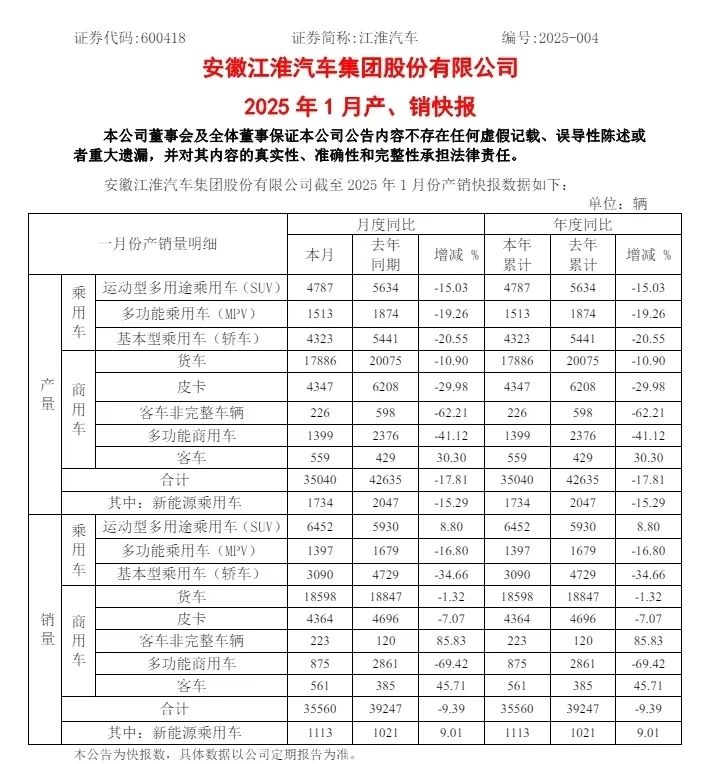 本年3月10日,江淮汽车发布产销快报,2月所有汽车销量2.69万辆,同比下降9.17%,其中新能源乘用车销量1041辆,同比下降40.34%。这是江淮汽车集合第5个月度销量出现下滑,2024年10月至2025年1月降幅鉴识为20.15%、15.68%、11.06%、9.39%。