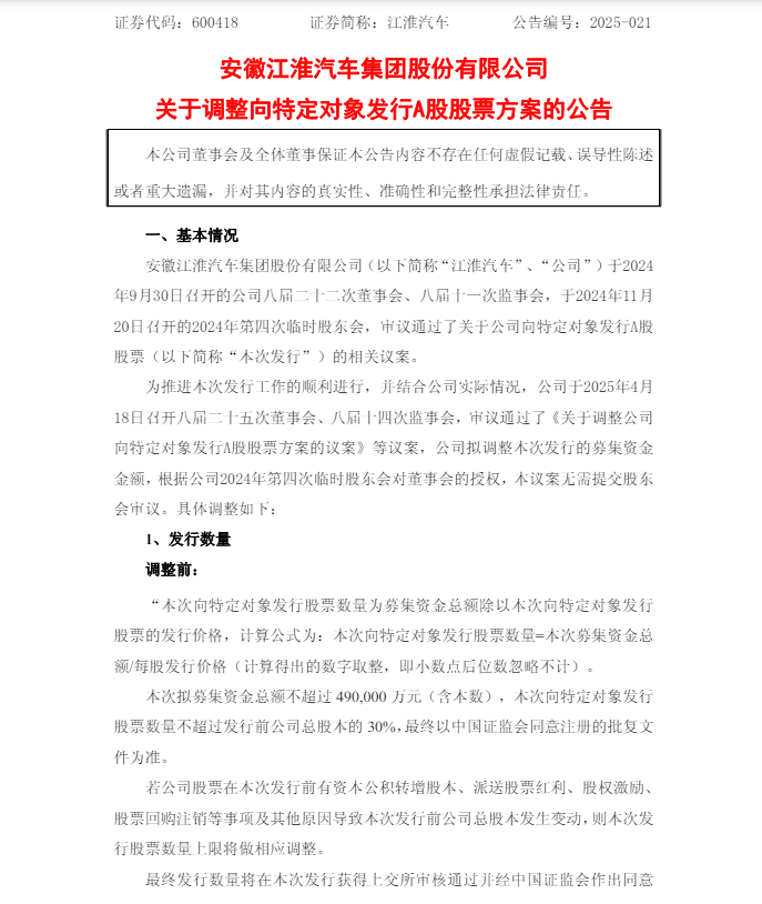 4月21日晚间kaiyun体育最新版,江淮汽车发布多条公告,公司拟退换向特定对象刊行A股股票决议,本次刊行的召募资金金额,由不跳跃 490,000 万元(含本数)退换为不跳跃 350,000 万元(含本数)。本次向特定对象刊行股票数目不跳跃刊行前公司总股本的 30%。
